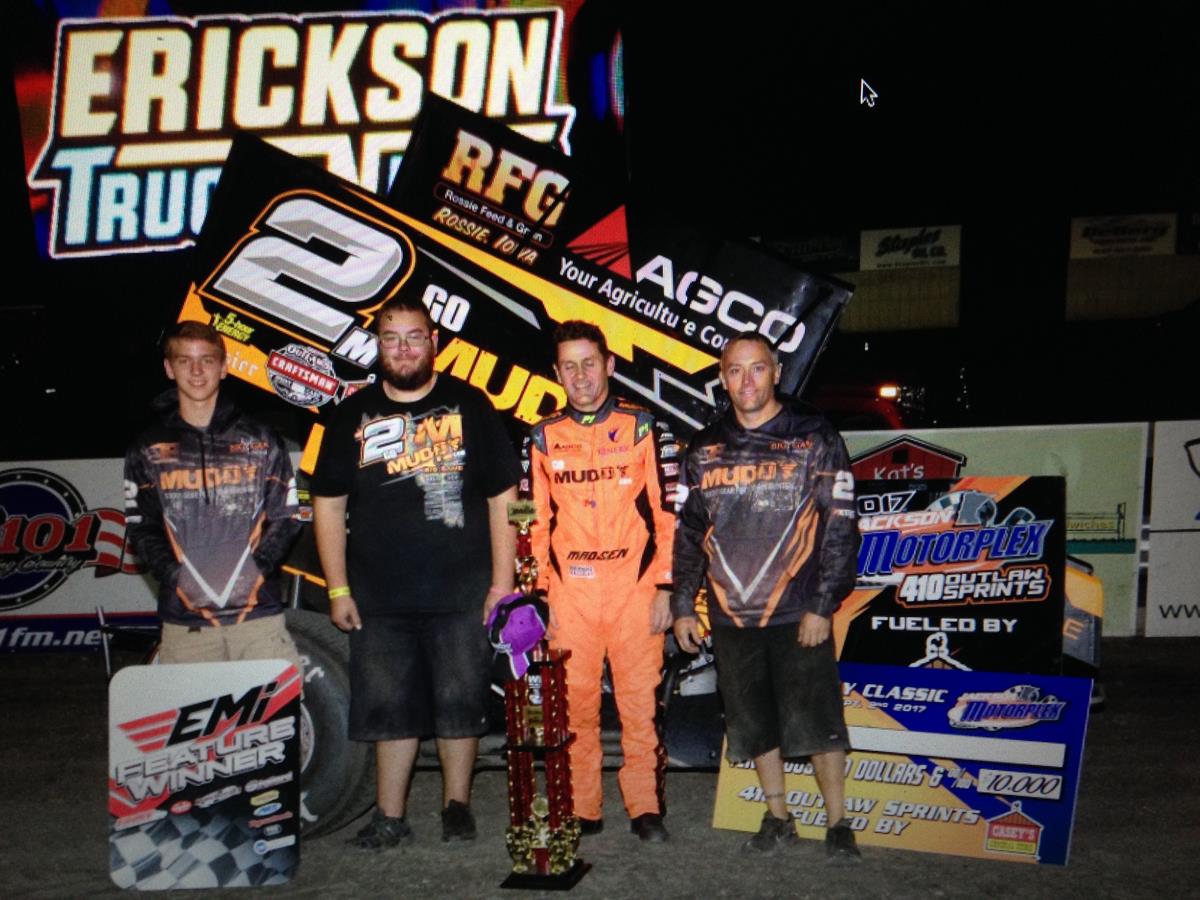 Madsen set quick time during qualifying, maneuvered from sixth to win a heat race and charged from eighth to garner the 410 Outlaw Sprints Fueled by Casey’s General Store main event – his track-best third triumph of the season.